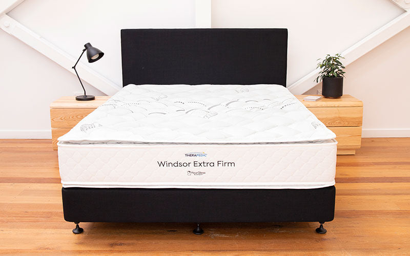 This medium-firm mattress features the Innergy alternating coil design that reduces motion transfer while improving lumbar support. This exclusive coil design eliminates sleep-disturbing motion transfer & allows each spring to respond individually to create an exceptionally supportive & comfortable sleep surface Patented HourGlass Back Support by Therapedic provides up to 18% more support to the lumbar region TheraFoam Encasement – Improves stability while increasing the usable sleep surface, eliminating roll together and increased edge support Wool blend pillow-top with foam comfort layers to provide additional pressure relief Flip this two-sided mattress for long-lasting comfort & support Mattress depth: 335mm Dimensions: This is a double-sided mattress and you can alternate between flipping and rotating it. After you first purchase this mattress, it should be should be flipped or rotated, on average, every fortnight. Once you’ve owned the mattress for a few months, it should be flipped or rotated every 3-6 months. This can help maintain more settlement between mattress layers, and will also help you maintain the conditions of your mattress warranty. Pictured on a black Upholstered Bed Base.